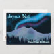 Luzes de norte roxas e azuis brilham sobre montanhas cobertas de neve em uma noite fria no Alasca. O texto francês que lê "Joyeux Noё l" aparece em azul e branco brilhantes. Adicione seu próprio texto adicional.