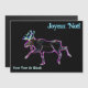 Uma representação neonatal de um alce num fundo preto. O texto francês que lê "Joyeux Noё l" aparece em azul e branco brilhantes. Adicione seu próprio texto adicional. Inspirado pelas luzes do Norte.