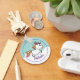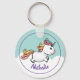 Crianças chaveiro com um unicórnio fofo rodando em uma nuvem com fundo azul.