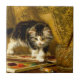 Azulejo cerâmico com a pintura a óleo de Henriëtte Ronner-Knip The Young Artist (1821-1909). Um gatinho preto e branco brinca com pintura e dois pincéis. Um presente adorável para amantes de gatos e entusiastas do Romantismo.