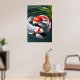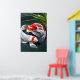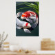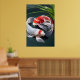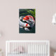Poster de dois peixes koi com padrões intrincados nadando lado a lado, de forma graciosa, contra um fundo verde escuro, realçado pela presença de algumas folhas vibrantes de plantas verdes. As escalas detalhadas e as delicadas barbatanas do koi criam uma cena aquática serena e harmoniosa.