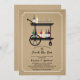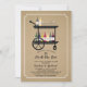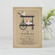 Carrinho de Bar moderno Estoque o Convite para Chá do Casal do Bar com um carrinho de bar com garrafas de álcool e vinho e óculos de bebida em um fundo kraft popular com um lado de trás correspondente.
