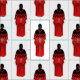 MMIW Kwe com o Tecido branco de padrão de mão vermelha pelo designer de moda nativo americano Ayasha Loya.