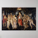 Esta pintura está exposta no Museu Uffizi. Essa pintura é cheio de alegorias (significados ocultos), o que leva a muito debate sobre como interpretar a pintura. No campo, você pode ver centenas de flores diferentes. A figura azul à direita é Zephyr, o deus do vento ocidental. Zephyr está perseguindo a ninfa Cloro, que está associada a flores e primavera. O hálito de Zephyr transforma Chloris em mulher com o vestido decorado com flores (que se pensa ser a deusa da Primavera, chamada Flora). A figura central no meio é Vênus. À esquerda de Vênus, os três Graces estão dançando. Os Graces são divindades menores na mitologia grega. À esquerda do Graces está Mercúrio, mensageiro dos deuses gregos, que está espalhando as nuvens com seu funcionarios. Algumas pessoas dizem que Mercúrio pode ser modelado a partir de Lorenzo de’ Medici que encomendou esta pintura. No topo de Vênus está Cupido apontando sua flamejante flamejante em um dos Graces. Uma descrição mais detalhada desta pintura pode ser encontrada em https://www.tripimprover.com/blog/la-primavera-by-sandro-botticelli.