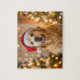 Um recuperador de ouros que veste um chapéu vermelho de Papai Noel. A sala com bokeh das luzes de Natal piscando no fundo.