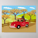 Labradores e Red Truck Fall View Poster para os fãs do Labrador! Quatro Labradores estão a caminho da Fazenda dos Sonhos! Eles têm suas macieiras lá. Três Labrador Amarelo Retrievers e um Labrador Preto Retriever são pintados na foto. Criada por Naomi Ochiai.