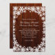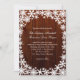 Lacy white, flocos de neve de inverno decoram a fronteira deste convite de casamento marrom escuro, que tem um fazer de fundo ilustrado de conselho de celeiro perfeito para o casamento no inverno rústico ou de condado.