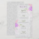 Este adorável menu romântico tem uma camada semelhante a véu sobre delicada renda de jardim de rosas cinza suave pintada à mão e buquê com um laço rosa chic transparente Coquette.