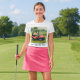 This comfortable t-shirt is perfect for any lady golfer. The design features a watercolor illustration of a beautiful golf course with a fun pink golf cart. The eye-catching slogan, "Tee Time, Me Time," adds a touch of personality. This unique t-shirt makes a thoughtful and memorable gift for the golf enthusiast in your life.
