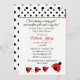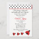 O convite para chás de fraldas de tripletes giros é feito em branco, com uma banda de bolinhas preta, na parte superior e nos joelhos vermelho e preto, na parte inferior. Personalize todos os campos de texto para o evento de chá de fraldas grande.