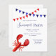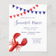 Um convite elegante para uma costa náutica pela festa de verão do mar, festa de praia ou mariscos. Um fundo branco e uma grande lagosta vermelha e bandeiras azuis e vermelhas como decoração. Modelos para detalhes de sua parte, informações. Fundo branco. 1 folha = 1 convite impresso de borda a borda.