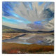 Uma design de arte de um lago com o dramático céu refletido na água do lago. Colinas e campos circundam o lago.