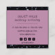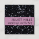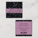 Cartão de visita com quadrado clássico com flocos prateados reluzentes em uma placa preta, com faixa cor-de-rosa. Os detalhes de seu contato, incluindo telefone, email, site e identificador de mídia social, estão no verso. Você pode personalizar ainda mais para remover ícones das mídias sociais que não usa e reposicionar ícones, se necessário.