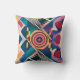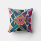 Uma imagem vibrante e cativante que mostra uma almofada de lançamento com padrão geométrico moderno. O padrão consiste em várias formas em cores ousadas e contrastantes, incluindo triângulos, quadrados e formas circulares. O design é simétrico, mas dinâmico, com uma sensação de movimento fluido.