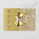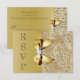 Cartões de resposta personalizados elegantes e sofisticados para casamento / aniversário ou festa de aniversário em ouro com uma bela imagem impressa em cores douradas cintilantes com lantejoulas e joias, padrão de pedras preciosas, imagens de laços e fitas impressas em ouro brilhante e diamantes digitais bonitos e joias cintilantes em um fundo gradiente dourado chique com texto fixo em efeito de metal dourado na frente e texto personalizável no verso. Por favor, note: Estas são imagens impressas planas - sem lantejoulas, laços ou partes elevadas reais. Estes cartões de resposta planos sofisticados, glamorosos e cheios de glamour são decorados / impressos em ambos os lados. RSVPs chiques, modernos e atuais para qualquer evento: - casamentos, chá de bebê, chá de noiva, festa de aniversário de mulheres, festas de 16 anos, celebrações de