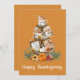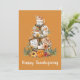 Um cartão de saudação de cor d'água de Ação de Graças, com bandeja em camadas carregada de abóboras, canecas de café com agulhas de especiarias, flores de queda, folhagem e uma fonte peculiar. Um tema animado de Ação de Graças para o dia deste ano para dar obrigados.