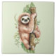 Um azulejo cerâmico com design de aquarela fofinho, com preguiça aguda pendurada num galho arbóreo cercado por folhas tropicais verdes. Fundo verde-oliva claro.