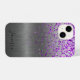 Glitter Púrpura Escovado no iPhone 14. Este caso mostra brilho púrpura cúbico em um fundo de metal prateado com lama de tendência. Personalize esta capa de telefone num monograma de tendências.
