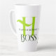 Caneca de café com monograma inicial para um chefe. Tons de verde com letra inicial maiúscula, nome completo e texto "chefe". Ao lado da escrita há uma borda de folhas verdes tropicais e folhas de palmeira.