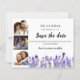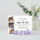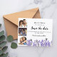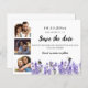 Decorados com flores de lavanda de cor aquosa. A Guardar o cartão de data para o seu casamento. O texto: Salvar a Data é gravado com um script de estilo com letra de tendência grande. Personalize e adicione 3 fotos. 1 folha = 1 Salve a data da borda impressa para a borda.