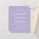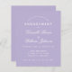 Um simples convite festa de noivado com uma cor moderna: lavanda (roxo claro). Tem apenas texto branco sobre fundo de lavanda. Os nomes são escritos num script caligráfico elegante, o resto em bonés. a primeira linha é texto arquivado.