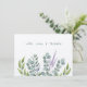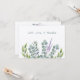 Obrigado cartões de mensagem com eucalipto e caules de lavanda. "Amor e obrigados" à frente, a azul, com uma mensagem de exemplo na parte de trás das placas de nota plana. O texto impresso, manuscrito, é azul e ambos os lados são decorados com hastes folhosas em tons de azul e verde, com um punho de lavanda. Os recém-casados podem mudar a mensagem e enviar aos obrigados convidados por presentes, aos membros da festa de casamento, e a todos os outros que ajudaram a fazer o dia do casamento especial. A placa 4x6 de tamanho menor é mostrada em uma atualização de papel feltro. Altere o tamanho e o papel conforme desejar ou escolha a opção de download.