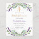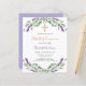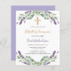 Um fundo branco decorado com flores lavandas e verde de eucalipto. Personalize e um nome e detalhes. Fundo: lavanda, fundo colorido violeta. 1 folha = 1 convite impresso de borda a borda.