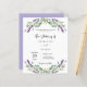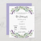 Um fundo branco decorado com flores lavandas e verde de eucalipto. Personalize e seus nomes e detalhes. Fundo: lavanda, fundo colorido violeta. 1 folha = 1 convite impresso de borda a borda.