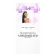 Cartão de menu de festa de aniversário. Personalize e adicione um nome, idade, data e menu. Um fundo branco e um arco grande, de cor violeta. Voltar: adicionar uma foto da aniversariante, fatos divertidos