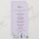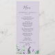 Este cartão de cardápio roxo de lavanda rústica é perfeito para um casamento simples e elegante ao ar livre. O design floral apresenta folhas de cor aquosa de eucalipto e verde com espinhos de flores silvestres roxas sobre fundo pálido e roxo. Este menu pode ser usado para recepção de casamento, janto de ensaio ou qualquer evento.