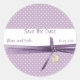 Manípulo pontilhado da lavanda salve o adesivo de data. Adornada com fita de cetim roxo e charme cardíaco. Personalize com suas próprias informações.
