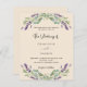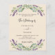 Um fundo de cor bege decorado com flores de lavanda e verde de eucalipto. Personalize e seus nomes e detalhes. 1 folha = 1 convite impresso de borda a borda.