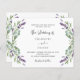Um fundo branco decorado com flores lavandas e verde de eucalipto. Personalize e seus nomes e detalhes. Voltar: adicione o URL do site de casamento ao código QR para obter detalhes e/ou RSVP. 1 folha = 1 convite impresso de borda a borda.