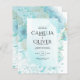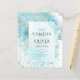 Flores de cor azul-azul-azul-de-vidro-do-mar bonito com folhas de ouro figuram neste convite elegante de casamento moderno.