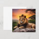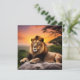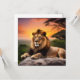 Belo Leão deitado numa rocha com o pôr do sol da selva atrás