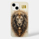 Ilustração intrincada da cabeça de um leão adornada com detalhes dourados brilhantes e padrões geométricos, simbolizando força, espiritualidade e criatividade artística.
