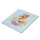 Azulejo cerâmico com uma pintura de aquarela fofa de um leão-mãe segurando seu filhote. Um bonito buquê floral roxo abaixo deles, adiciona um toque gentil a esta doce e adorável imagem. Fundo azul claro.