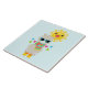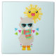 Um azulejo cerâmico com uma lama legal vestindo alguns óculos escuros. Vestido num lenço listrado colorido e botas divertidas. Um sol amarelo brilhante com um rosto kawaii feliz no fundo. Triângulos brancos e coloridos rodeiam esta divertida lhama amorosa. Fundo azul.