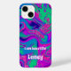 Minha filha e eu criamos esse design de espiral legal em verde-claro, roxo, azul e rosa-quente. Adicionamos um pouco de brilho falso para um efeito de brilho. Ele cria o fundo perfeito para um arco-íris ranzinza um tipo de capa de telefone. Personalize este telefone com um nome. Você também pode adicionar um texto personalizado ou uma citação inspiradora. Ou apagar se desejar. O roteiro divertido está em branco com contorno rosa. Espero que goste desta capa de telefone retrorreflectora ondulada.