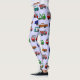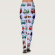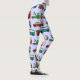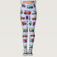 Estas leggings têm um design de caminhões e ônibus novidade em vermelho, azul, verde e marrom em um campo de azul claro.