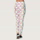 Estas leggings têm um design de arte deco de laranja, turquesa, rosa, azul, roxo e meio círculo amarelo se conectam com linhas em um campo de branco.
