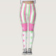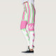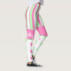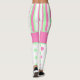 Leggings bonito, cor-de-rosa, verdes e brancas, com gráficos de corações grandes, na parte inferior das leggings e listras, na metade superior. Uma grande banda cor-de-rosa, que atravessa a área do joelho, tem um texto branco personalizado pronto para personalizar. Excelente de fazer exercícios e correr pela cidade.
