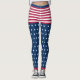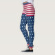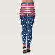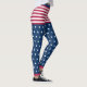 Vocês terão orgulho de vestir as cores dos Estados Unidos nas suas leggings com este design original em branco, vermelho e azul com estrelas e listras. A faixa de cintura é azul, os shorts são riscados em vermelho e branco, as pernas têm um padrão de estrelas brancas sobre um fundo azul. Perfeito para todos os feriados patrióticos e muito mais.