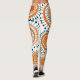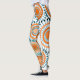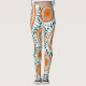 Essas leggings têm um design de anéis e círculos em tons de laranja com linhas de lacre atravessando atrás delas formando flores em um campo de branco.