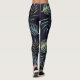 Folhas tropicais verdes e folhas de palma desenhadas à mão sobre leggings marinho azuis de na moda.