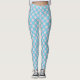 Imagem dividida mostrando vistas frontal e traseira de leggings. Elas apresentam um padrão xadrez azul claro e rosa. O modelo usa tênis preto. O tom é casual.