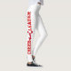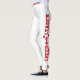 Estas leggings brancas são uma forma excelente de os cheerleaderes ficarem aquecidos, com a inscrição em bloco vermelho lendo Líder Cheer subindo pelos dois lados das leggings. Gráficos vermelhos de uma silhueta de cheerleader decoram os lados, entre as letras.