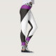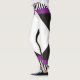 Uma forma de diamante branco com seu nome, bandas roxas e triângulos pretos estão incluídos na frente deste par de leggings. Na parte superior e inferior há um padrão preto e branco listrado. A parte de trás é maioritariamente de cor preta.