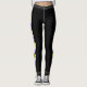 Leggings with the hearts and stripes in colors of the non-binary / enby pride flag; a design with yellow, white, purple, and dark gray hearts and stripes on a black background