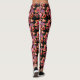 Leggings com um padrão de pirulitos com coração duplo, vermelhos, laranja, rosa e roxos, desenhados à mão e digitalmente, com textura de folha metálica colorida, sobre um fundo preto.
